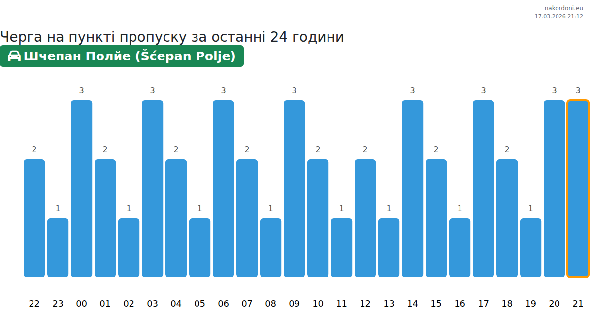 Для уникнення довгих черг на кордоні на пункті пропуску Шчепан Полйе (Šćepan Polje) - авто, рекомендуємо планувати перетин кордону в години найменшого навантаження. Згідно з даними за минулу добу, найменша кількість автомобілів спостерігалася між :00 та 2:00 годинами. Це ідеальний час для перетину кордону, щоб зекономити час і уникнути затримок.