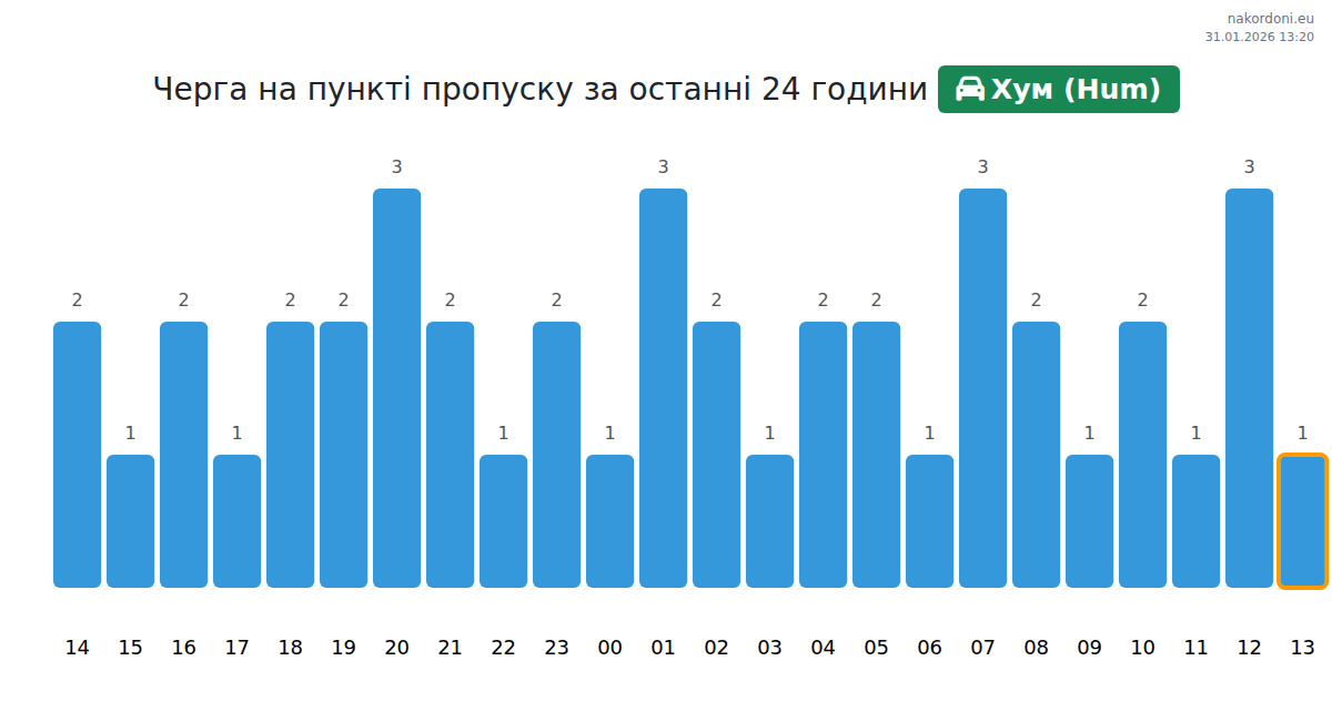 Плануйте свої поїздки заздалегідь, використовуючи актуальну інформацію про черги на кордоні на пункті пропуску Хум (Hum) - легковий автомобіль, щоб зробити ваш перетин швидким і зручним. Приділіть особливу увагу цим годинам, щоб уникнути пікового навантаження і зменшити час очікування.