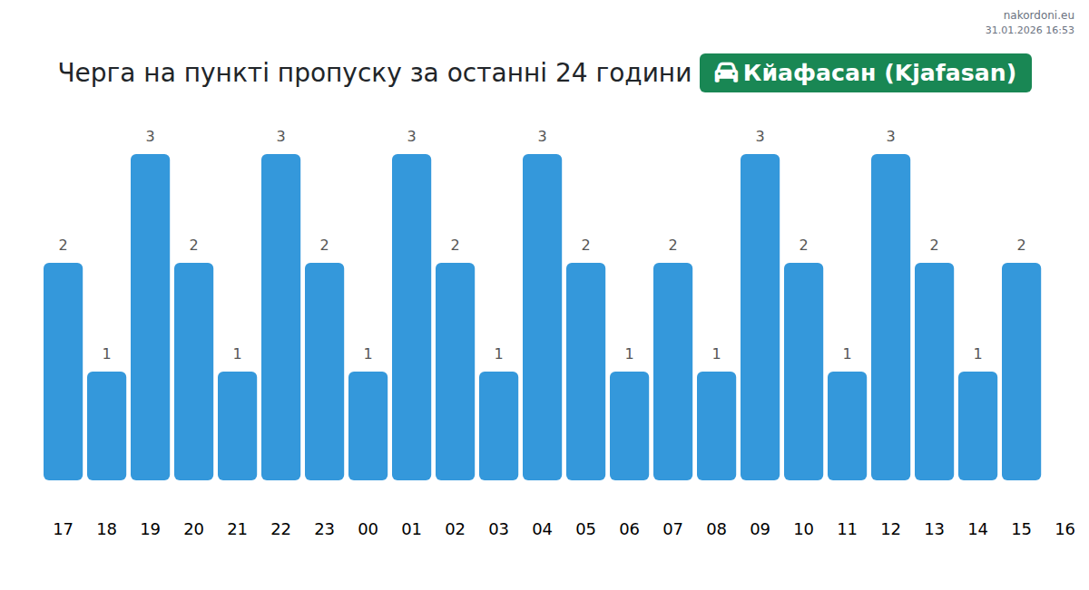 Для уникнення довгих черг на кордоні на пункті пропуску Кйафасан (Kjafasan) - легковий автомобіль, рекомендуємо планувати перетин кордону в години найменшого навантаження. Згідно з даними за минулу добу, найменша кількість автомобілів спостерігалася між :00 та 2:00 годинами. Це ідеальний час для перетину кордону, щоб зекономити час і уникнути затримок.