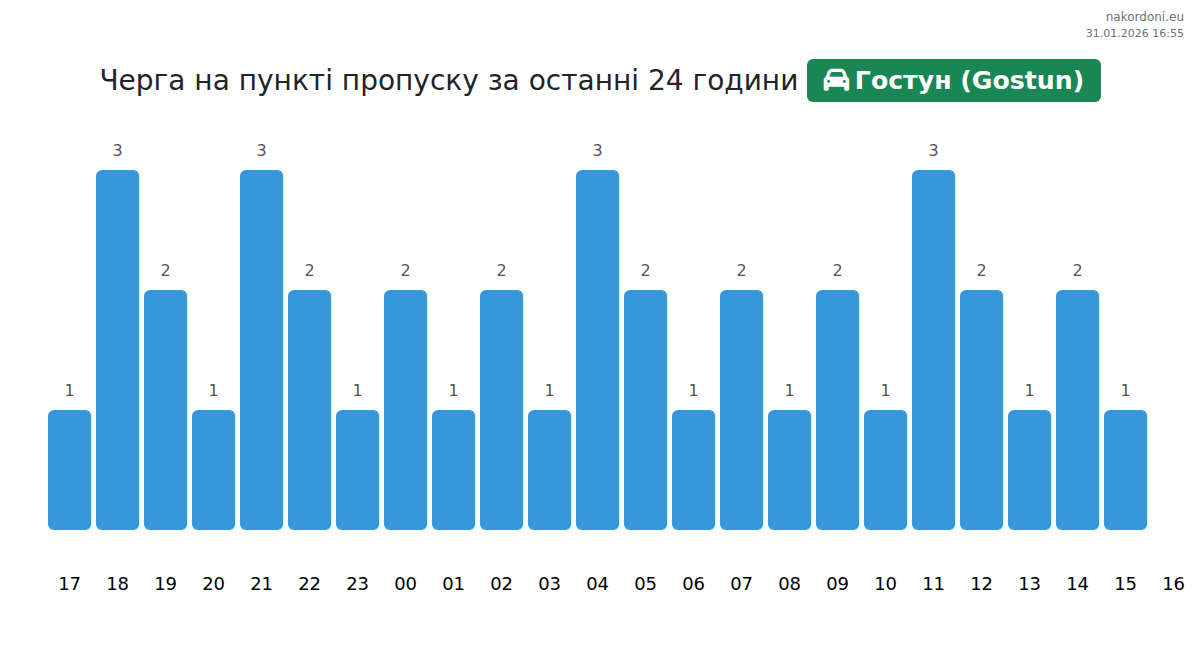 Для уникнення довгих черг на кордоні на пункті пропуску Гостун (Gostun) - легковий автомобіль, рекомендуємо планувати перетин кордону в години найменшого навантаження. Згідно з даними за минулу добу, найменша кількість автомобілів спостерігалася між 1:00 та 4:00 годинами. Це ідеальний час для перетину кордону, щоб зекономити час і уникнути затримок.