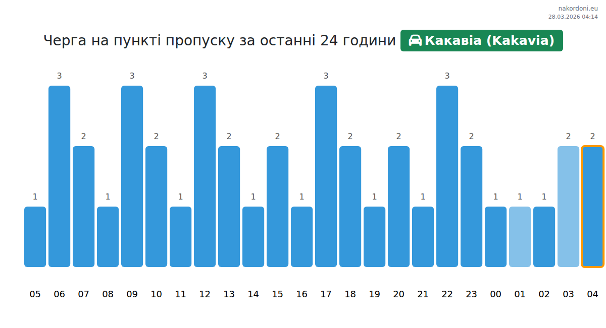 Для уникнення довгих черг на кордоні на пункті пропуску Какавіа (Kakavia) - легковий автомобіль, рекомендуємо планувати перетин кордону в години найменшого навантаження. Згідно з даними за минулу добу, найменша кількість автомобілів спостерігалася між 2:00 та 5:00 годинами. Це ідеальний час для перетину кордону, щоб зекономити час і уникнути затримок.