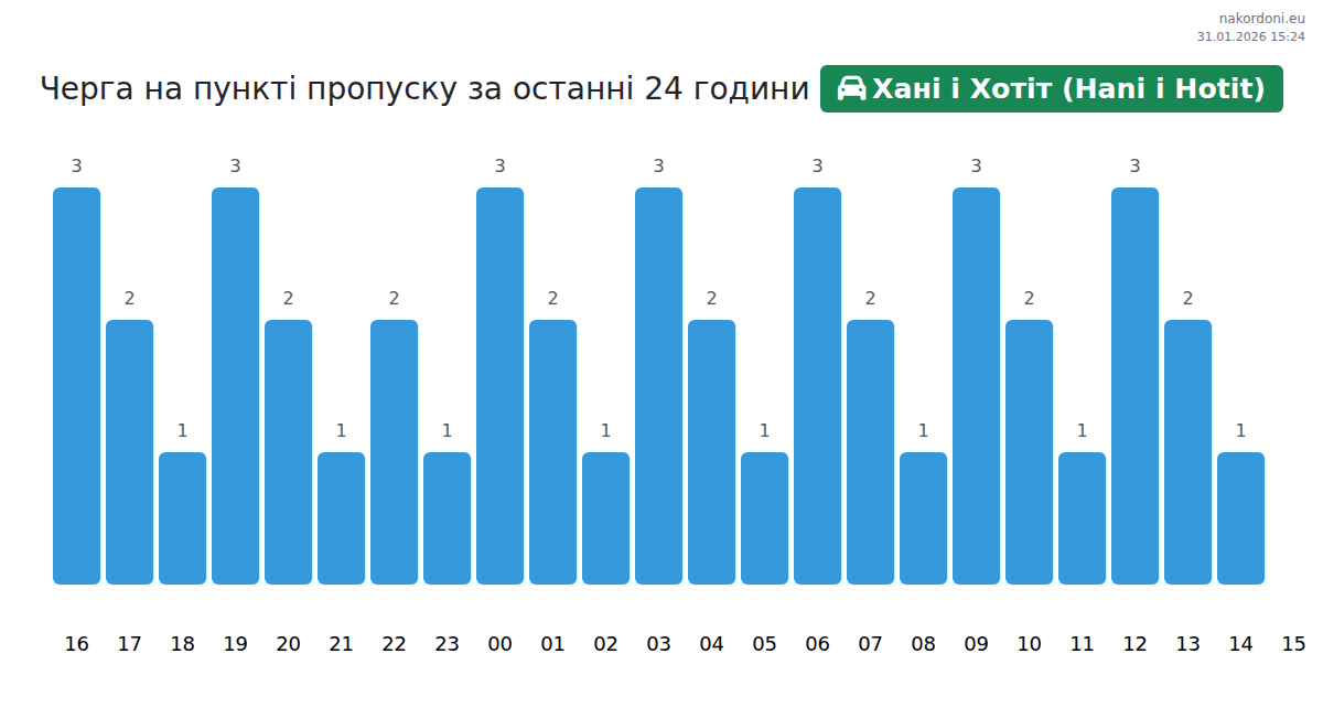 Для уникнення довгих черг на кордоні на пункті пропуску Хані і Хотіт (Hani i Hotit) - легковий автомобіль, рекомендуємо планувати перетин кордону в години найменшого навантаження. Згідно з даними за минулу добу, найменша кількість автомобілів спостерігалася між 1:00 та 3:00 годинами. Це ідеальний час для перетину кордону, щоб зекономити час і уникнути затримок.