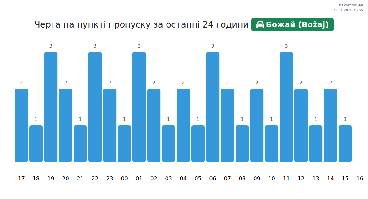 Для уникнення довгих черг на кордоні на пункті пропуску Божай (Božaj) - легковий автомобіль, рекомендуємо планувати перетин кордону в години найменшого навантаження. Згідно з даними за минулу добу, найменша кількість автомобілів спостерігалася між :00 та 2:00 годинами. Це ідеальний час для перетину кордону, щоб зекономити час і уникнути затримок.