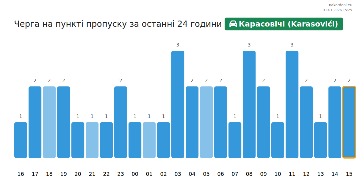 Плануйте свої поїздки заздалегідь, використовуючи актуальну інформацію про черги на кордоні на пункті пропуску Карасовічі (Karasovići) - легковий автомобіль, щоб зробити ваш перетин швидким і зручним. Приділіть особливу увагу цим годинам, щоб уникнути пікового навантаження і зменшити час очікування.