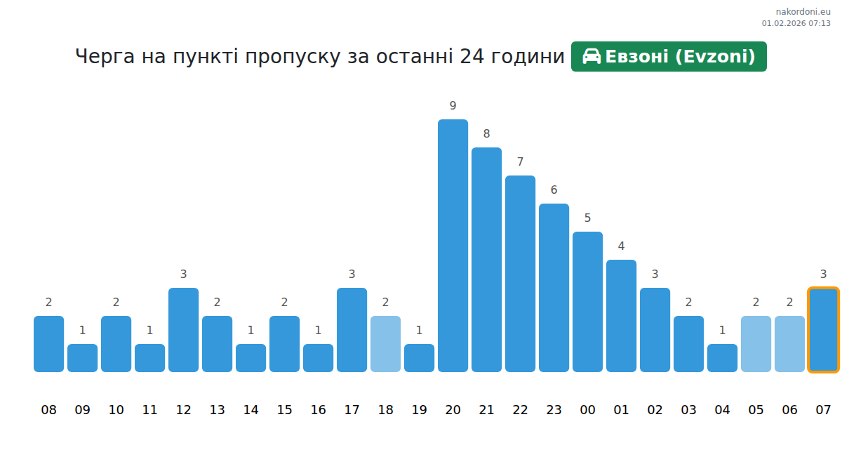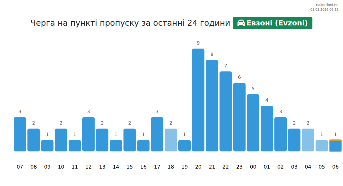 Для уникнення довгих черг на кордоні на пункті пропуску Евзоні (Evzoni) - легковий автомобіль, рекомендуємо планувати перетин кордону в години найменшого навантаження. Згідно з даними за минулу добу, найменша кількість автомобілів спостерігалася між :00 та 3:00 годинами. Це ідеальний час для перетину кордону, щоб зекономити час і уникнути затримок.