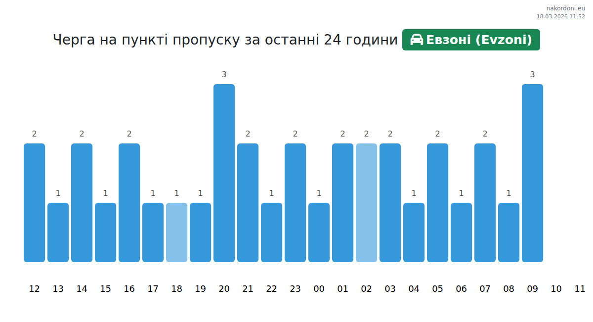 Для уникнення довгих черг на кордоні на пункті пропуску Евзоні (Evzoni) - авто, рекомендуємо планувати перетин кордону в години найменшого навантаження. Згідно з даними за минулу добу, найменша кількість автомобілів спостерігалася між :00 та 2:00 годинами. Це ідеальний час для перетину кордону, щоб зекономити час і уникнути затримок.
