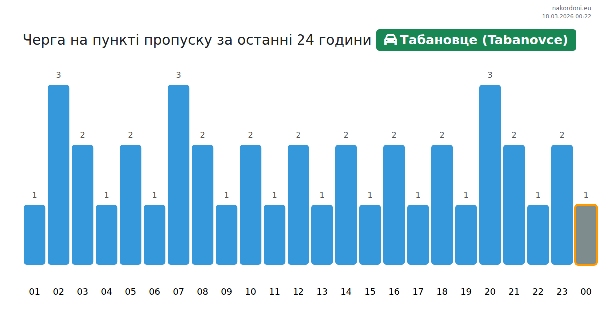 Для уникнення довгих черг на кордоні на пункті пропуску Табановце (Tabanovce) - авто, рекомендуємо планувати перетин кордону в години найменшого навантаження. Згідно з даними за минулу добу, найменша кількість автомобілів спостерігалася між 1:00 та 4:00 годинами. Це ідеальний час для перетину кордону, щоб зекономити час і уникнути затримок.