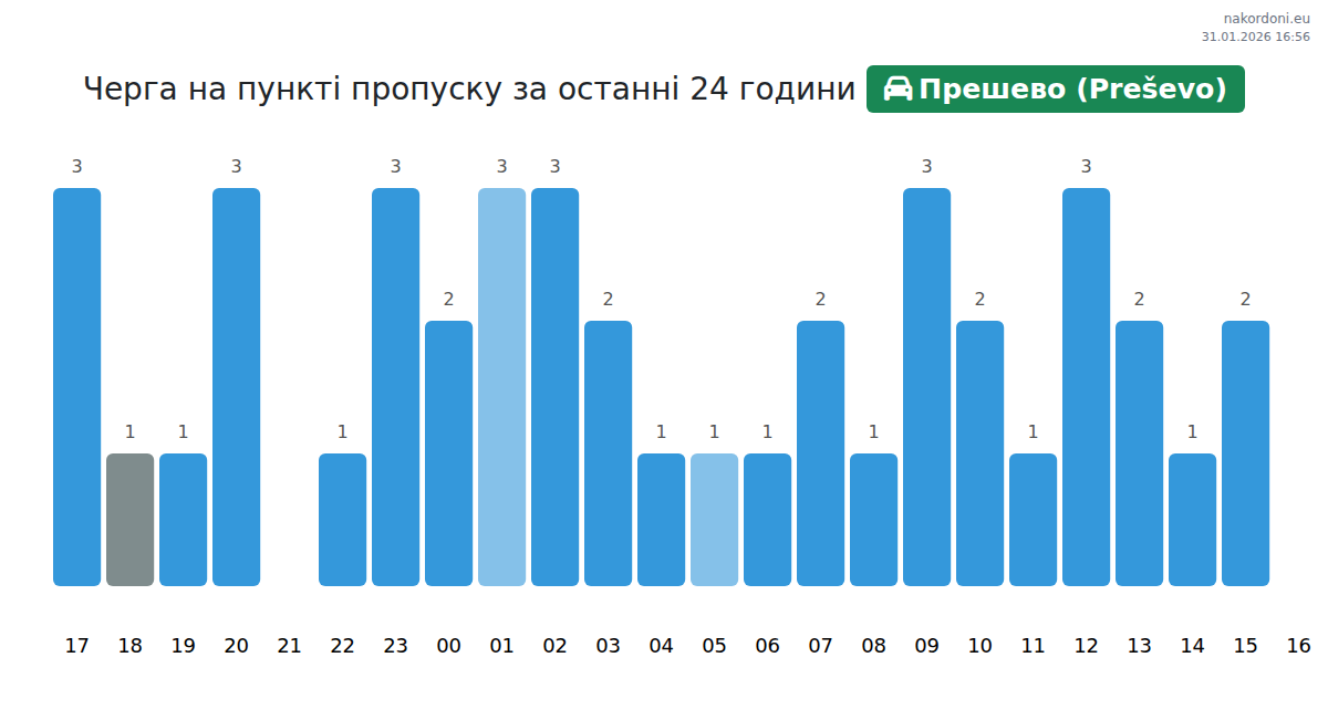 Для уникнення довгих черг на кордоні на пункті пропуску Прешево (Preševo) - легковий автомобіль, рекомендуємо планувати перетин кордону в години найменшого навантаження. Згідно з даними за минулу добу, найменша кількість автомобілів спостерігалася між :00 та 3:00 годинами. Це ідеальний час для перетину кордону, щоб зекономити час і уникнути затримок.