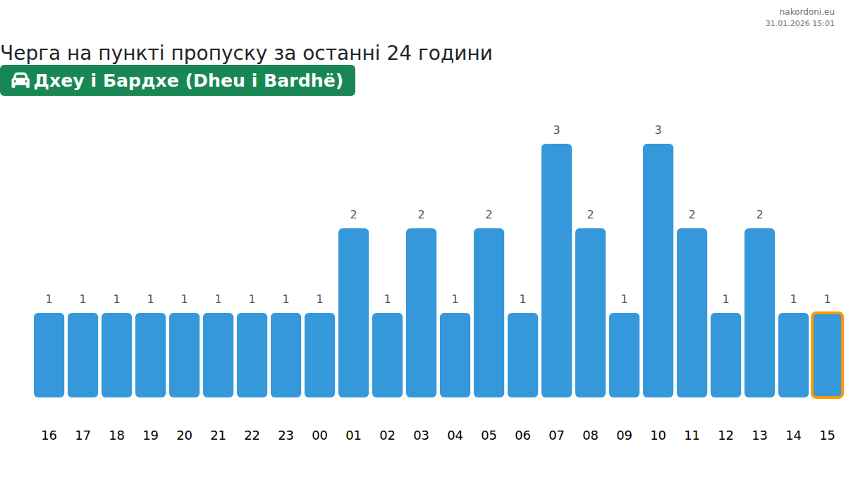 Для уникнення довгих черг на кордоні на пункті пропуску Дхеу і Бардхе (Dheu i Bardhë) - легковий автомобіль, рекомендуємо планувати перетин кордону в години найменшого навантаження. Згідно з даними за минулу добу, найменша кількість автомобілів спостерігалася між :00 та 2:00 годинами. Це ідеальний час для перетину кордону, щоб зекономити час і уникнути затримок.