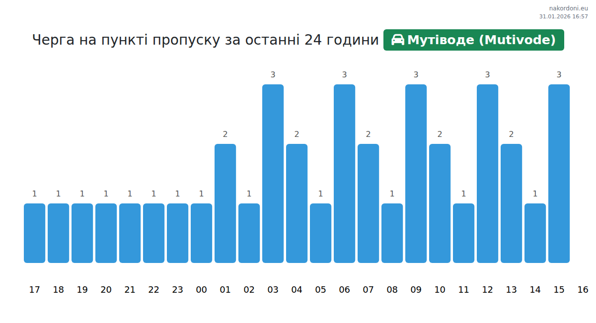 Для уникнення довгих черг на кордоні на пункті пропуску Мутіводе (Mutivode) - легковий автомобіль, рекомендуємо планувати перетин кордону в години найменшого навантаження. Згідно з даними за минулу добу, найменша кількість автомобілів спостерігалася між :00 та 2:00 годинами. Це ідеальний час для перетину кордону, щоб зекономити час і уникнути затримок.