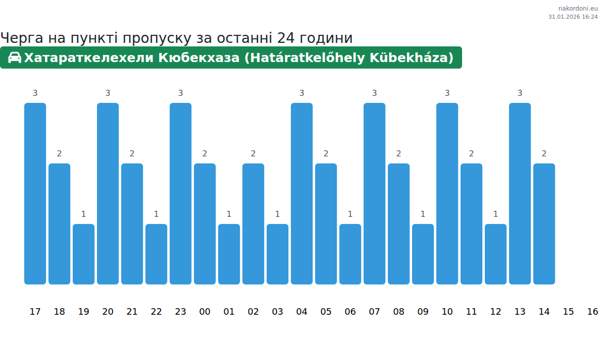 Для уникнення довгих черг на кордоні на пункті пропуску Хатараткелехели Кюбекхаза (Határatkelőhely Kübekháza) - легковий автомобіль, рекомендуємо планувати перетин кордону в години найменшого навантаження. Згідно з даними за минулу добу, найменша кількість автомобілів спостерігалася між 1:00 та 3:00 годинами. Це ідеальний час для перетину кордону, щоб зекономити час і уникнути затримок.