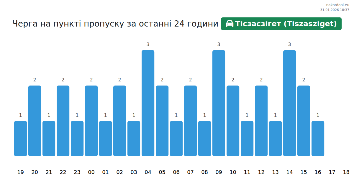 Для уникнення довгих черг на кордоні на пункті пропуску Тісзасзігет (Tiszasziget) - легковий автомобіль, рекомендуємо планувати перетин кордону в години найменшого навантаження. Згідно з даними за минулу добу, найменша кількість автомобілів спостерігалася між 1:00 та 4:00 годинами. Це ідеальний час для перетину кордону, щоб зекономити час і уникнути затримок.