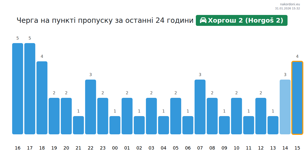 Плануйте свої поїздки заздалегідь, використовуючи актуальну інформацію про черги на кордоні на пункті пропуску Хоргош 2 (Horgoš 2) - легковий автомобіль, щоб зробити ваш перетин швидким і зручним. Приділіть особливу увагу цим годинам, щоб уникнути пікового навантаження і зменшити час очікування.
