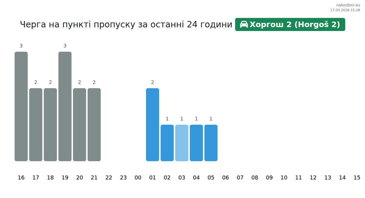 За період 16.03.2026 з 00:00 по 23:59 на кордоні на пункті пропуску Хоргош 2 (Horgoš 2) - легковий автомобіль були зафіксовані наступні ключові моменти: