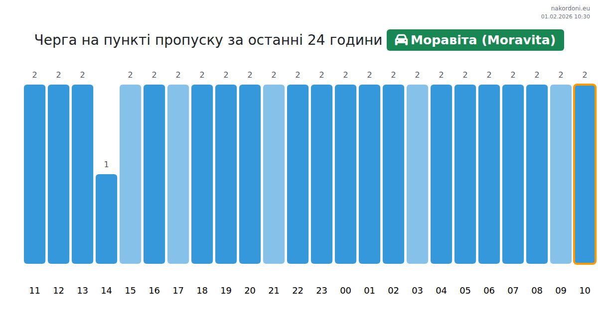 Для уникнення довгих черг на кордоні на пункті пропуску Моравіта (Moravita) - легковий автомобіль, рекомендуємо планувати перетин кордону в години найменшого навантаження. Згідно з даними за минулу добу, найменша кількість автомобілів спостерігалася між 3:00 та 14:00 годинами. Це ідеальний час для перетину кордону, щоб зекономити час і уникнути затримок.
