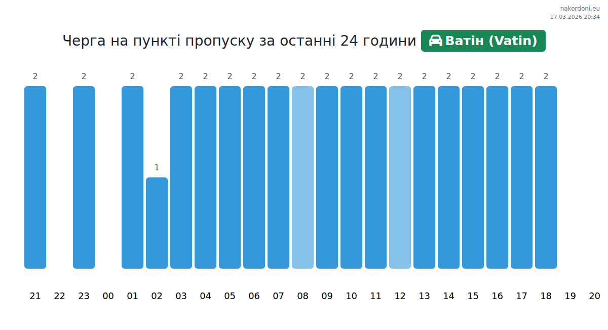 На пункті пропуску Ватін (Vatin) час очікування для легкових авто становить 15-25 хвилин. Рекомендуємо уникати годин пік о 15:00, 16:00 та 20:00. Найкращий час для швидкого перетину кордону — 17:00, 18:00 та 19:00.