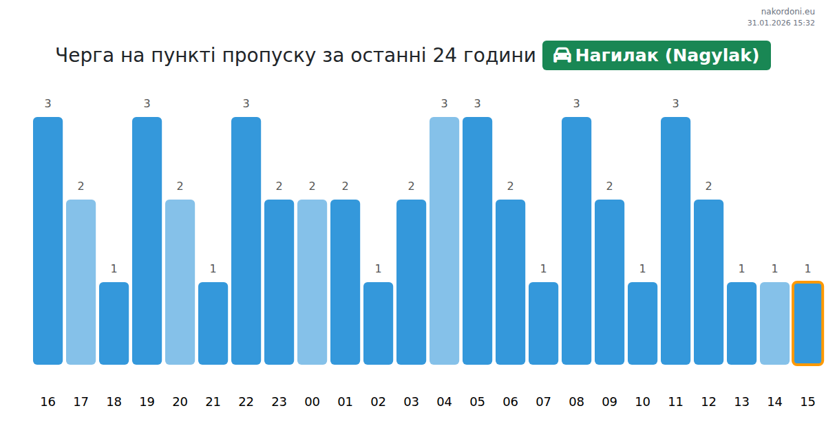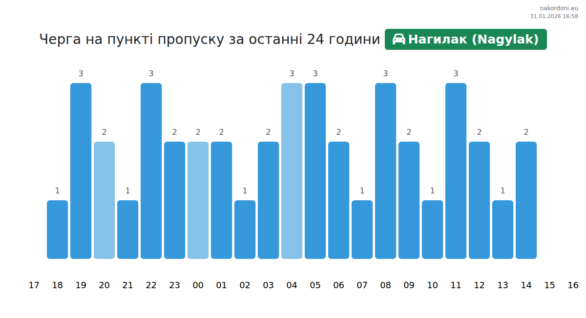 Для уникнення довгих черг на кордоні на пункті пропуску Нагилак (Nagylak) - легковий автомобіль, рекомендуємо планувати перетин кордону в години найменшого навантаження. Згідно з даними за минулу добу, найменша кількість автомобілів спостерігалася між 1:00 та 4:00 годинами. Це ідеальний час для перетину кордону, щоб зекономити час і уникнути затримок.