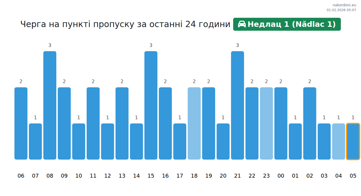 Для уникнення довгих черг на кордоні на пункті пропуску Недлац 1 (Nădlac 1) - легковий автомобіль, рекомендуємо планувати перетин кордону в години найменшого навантаження. Згідно з даними за минулу добу, найменша кількість автомобілів спостерігалася між 1:00 та 4:00 годинами. Це ідеальний час для перетину кордону, щоб зекономити час і уникнути затримок.