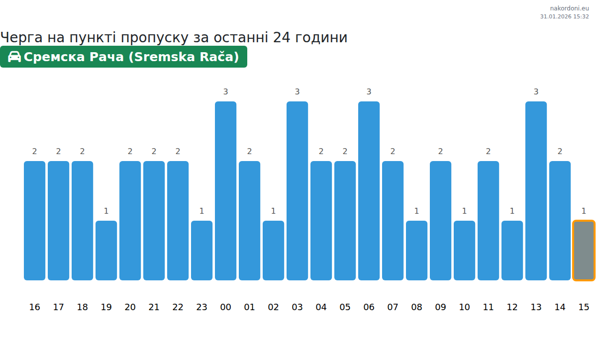 Плануйте свої поїздки заздалегідь, використовуючи актуальну інформацію про черги на кордоні на пункті пропуску Сремска Рача (Sremska Rača) - легковий автомобіль, щоб зробити ваш перетин швидким і зручним. Приділіть особливу увагу цим годинам, щоб уникнути пікового навантаження і зменшити час очікування.
