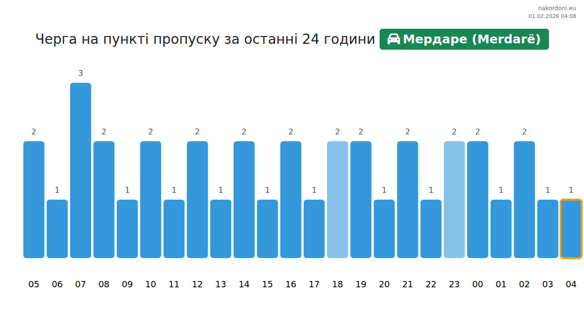 Для уникнення довгих черг на кордоні на пункті пропуску Мердаре (Merdarë) - легковий автомобіль, рекомендуємо планувати перетин кордону в години найменшого навантаження. Згідно з даними за минулу добу, найменша кількість автомобілів спостерігалася між :00 та 2:00 годинами. Це ідеальний час для перетину кордону, щоб зекономити час і уникнути затримок.