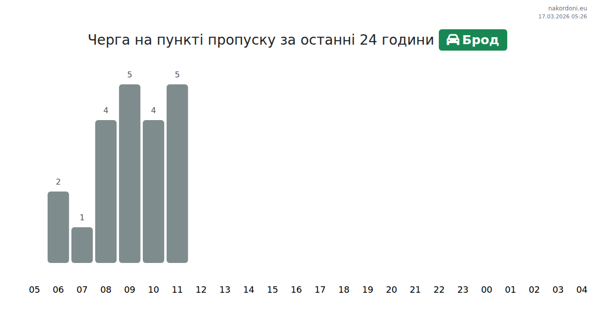 На пункті пропуску Брод час очікування становить 71-119 хвилин. Рекомендуємо уникати годин пік об 11:00, 12:00 та 14:00 для швидшого проїзду. Найкращий час для перетину кордону — 05:00, 19:00 або 21:00.