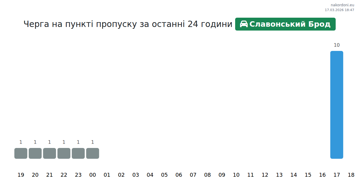 На пункті пропуску Славонський Брод очікування для легкових авто складе 71-77 хв. Рекомендуємо уникати годин пік о 10:00, 13:00 та 03:00. Найкращий час для швидкого перетину кордону — 11:00, 12:00 або 14:00.