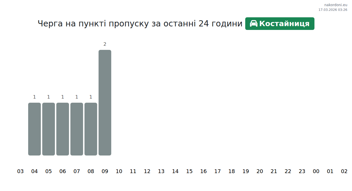 За період 17.03.2026 з 00:00 по 23:59 на кордоні на пункті пропуску Костайниця - легковий автомобіль були зафіксовані наступні ключові моменти: