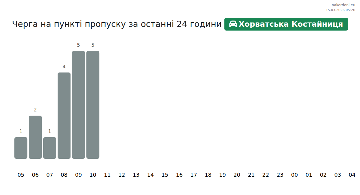 На пункті пропуску Хорватська Костайниця час очікування для легкових авто становить 71-107 хвилин. Уникайте пікових годин об 11:00, 09:00 та 10:00. Найкращий час для перетину кордону — 20:00, 23:00 або 00:00.
