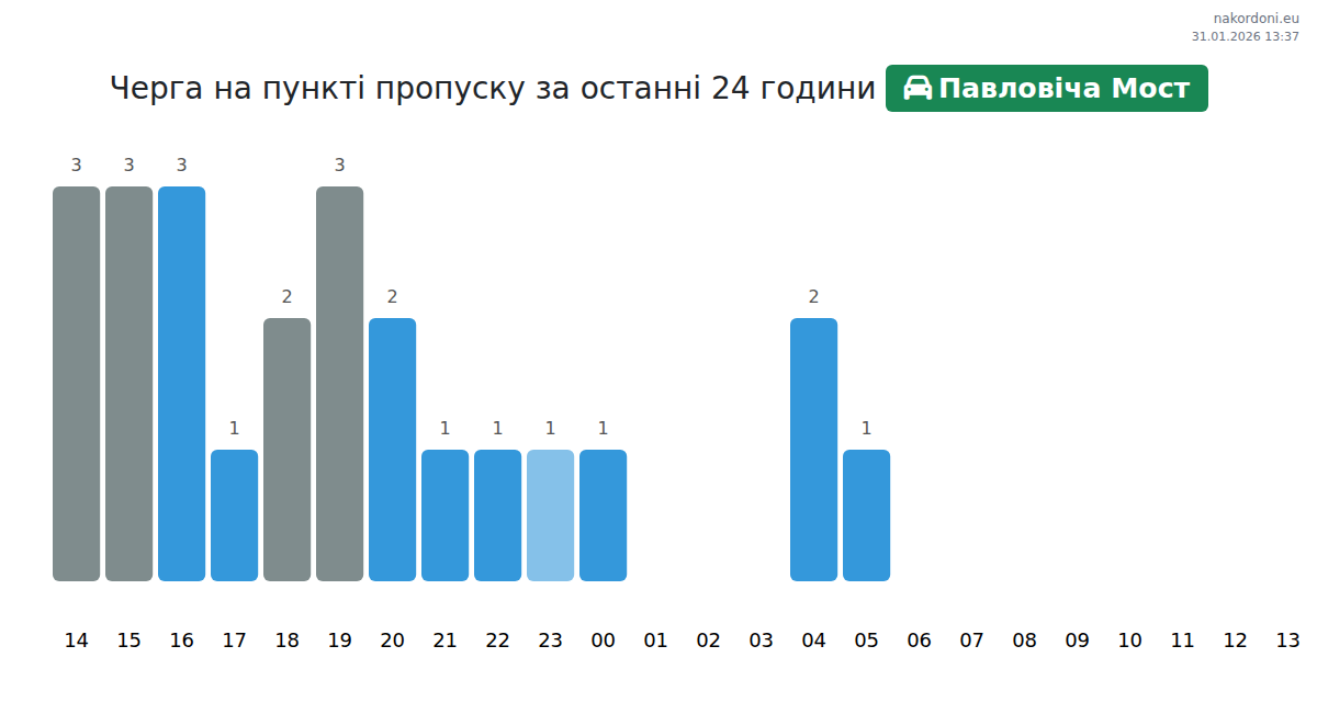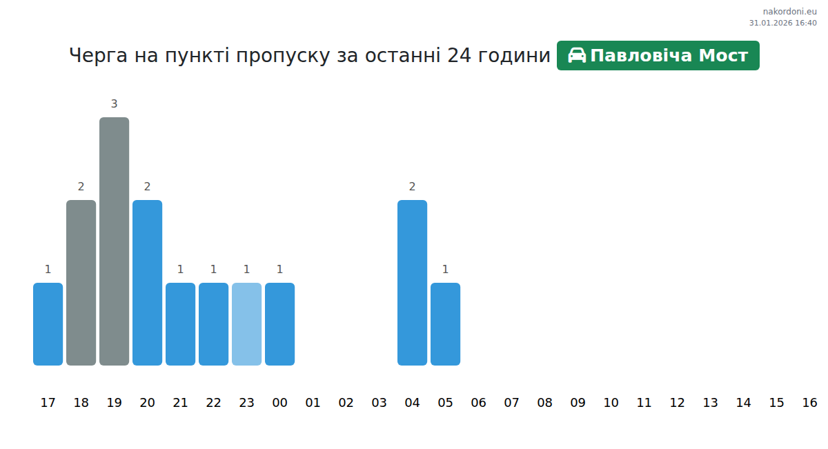 Для уникнення довгих черг на кордоні на пункті пропуску Павловіча Мост - легковий автомобіль, рекомендуємо планувати перетин кордону в години найменшого навантаження. Згідно з даними за минулу добу, найменша кількість автомобілів спостерігалася між 17:00 та 20:00 годинами. Це ідеальний час для перетину кордону, щоб зекономити час і уникнути затримок.