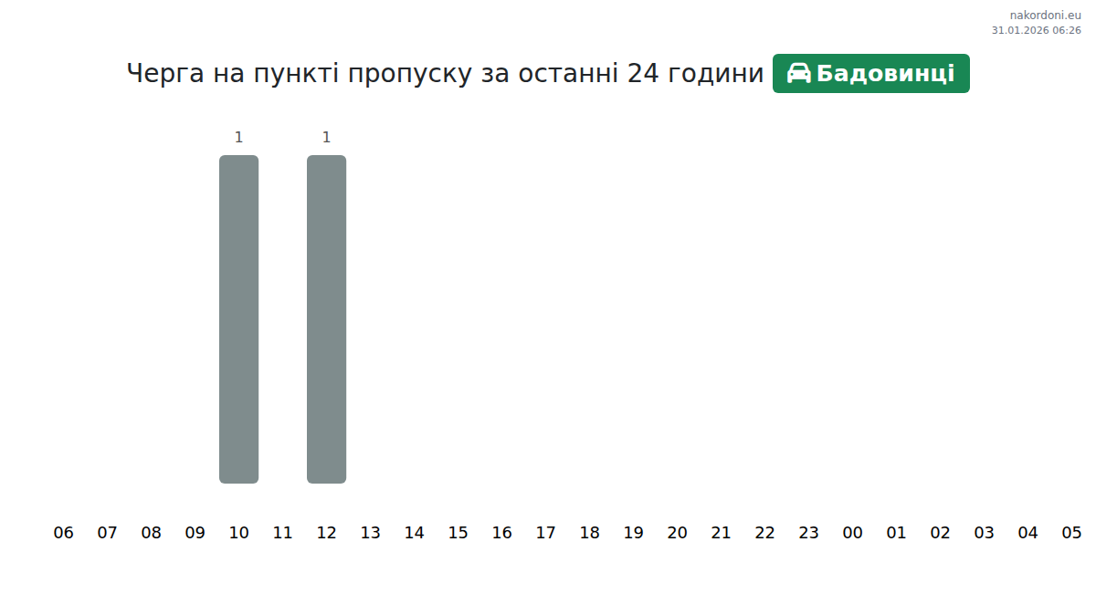 На пункті пропуску Бадовинці очікується черга від 71 до 83 хвилин. Найбільше завантаження прогнозується о 14:00, 15:00 та 16:00, тому краще планувати поїздку на 01:00, 02:00 або 03:00.