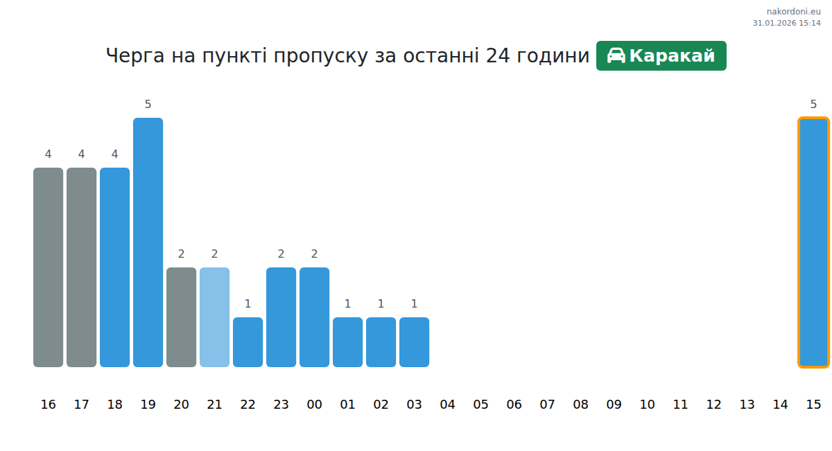 Для уникнення довгих черг на кордоні на пункті пропуску Каракай - легковий автомобіль, рекомендуємо планувати перетин кордону в години найменшого навантаження. Згідно з даними за минулу добу, найменша кількість автомобілів спостерігалася між 19:00 та 22:00 годинами. Це ідеальний час для перетину кордону, щоб зекономити час і уникнути затримок.