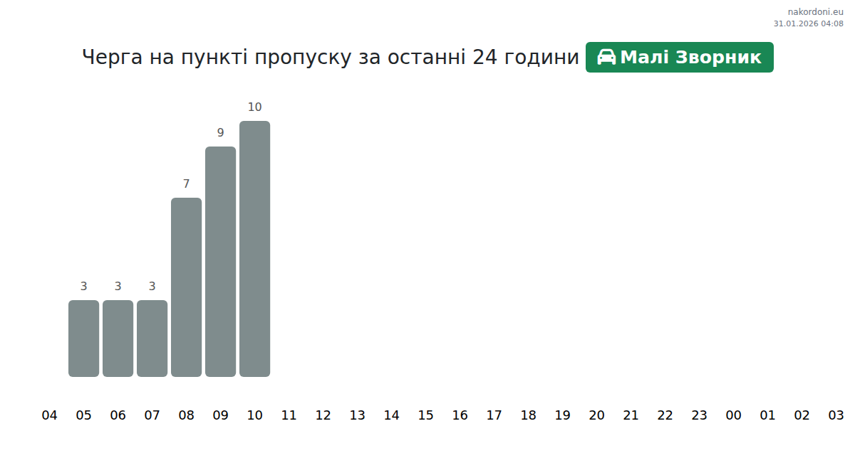 На пункті пропуску Малі Зворник час очікування для легкових авто становить 71-167 хвилин. Рекомендуємо уникати пікових годин об 11:00, 12:00 та 15:00. Найкраще планувати перетин кордону на 02:00, 20:00 або 21:00.