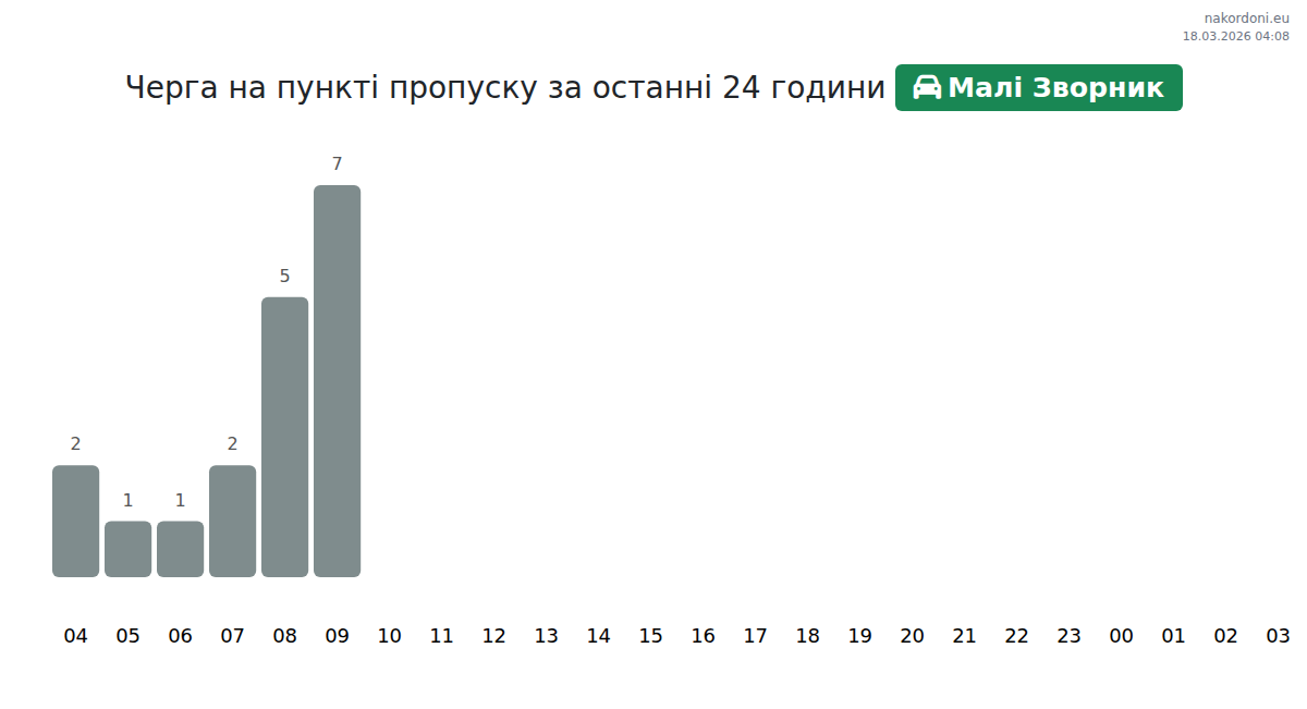 На пункті пропуску Малі Зворник очікуване очікування для легкових авто становить 71-119 хвилин. Рекомендуємо уникати пікових годин о 15:00, 09:00 та 12:00. Найкращий час для швидкого перетину — о 20:00, 21:00 або 23:00.