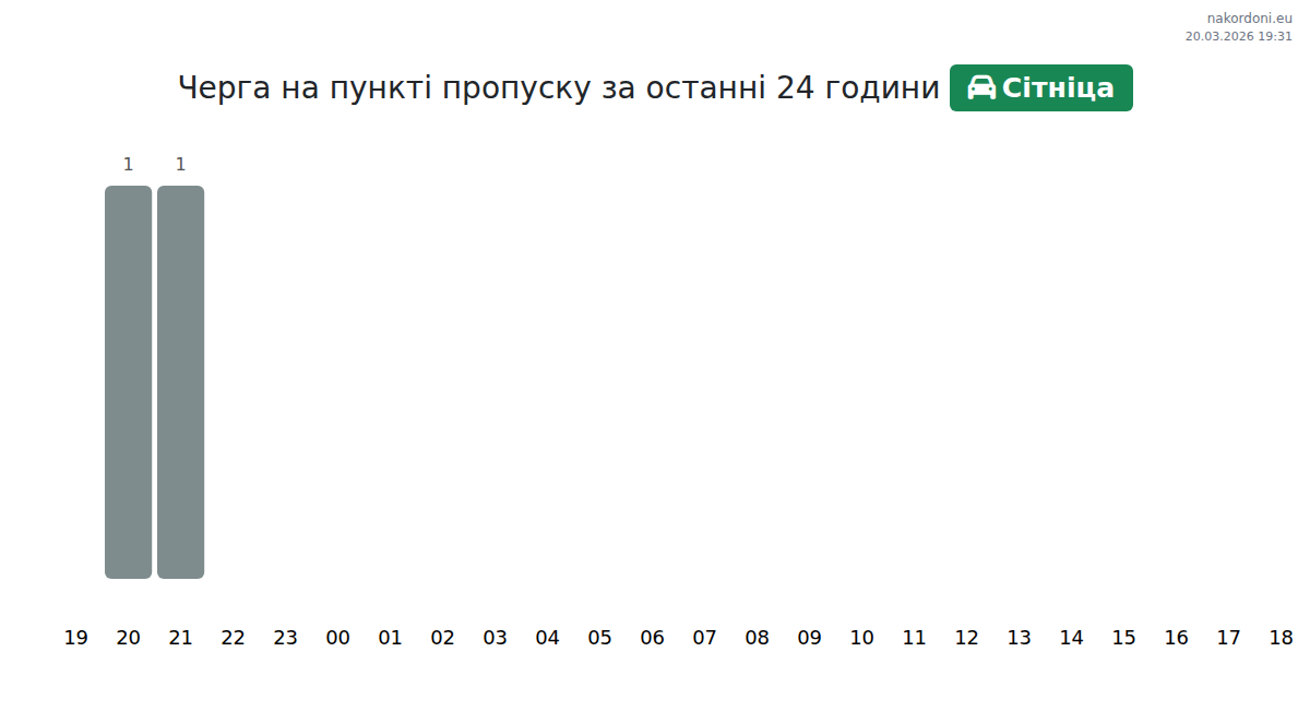 На пункті Сітніца до кінця завтрашнього дня очікується черга 65–71 хвилин для легкових авто. Піки навантаження: 21:00, 18:00, 19:00. Найменші черги очікуються о 22:00, 23:00, 00:00. Цієї ночі та завтра вранці трафік буде помірним.