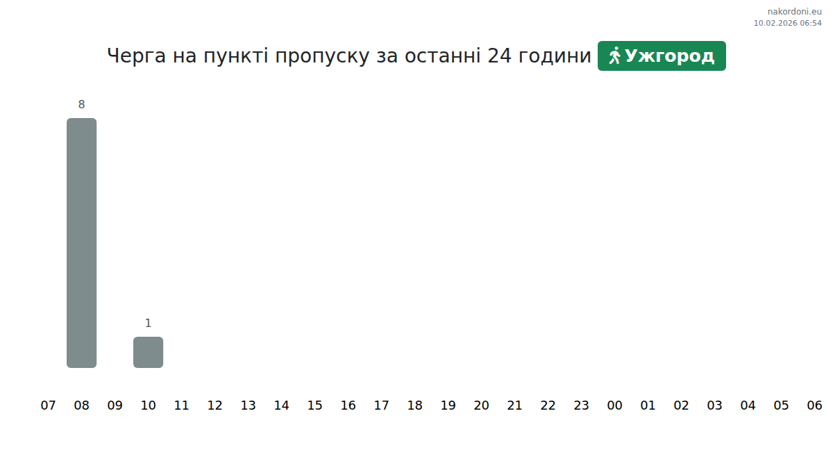 На пункті пропуску Ужгород прогнозований час очікування для транспортних засобів становить 15-108 хвилин, в середньому 29 хвилин. Щоб уникнути найдовших черг, краще об'їжджати пікові години о 20:00, 14:00 та 13:00. Найкоротші черги очікуються о 01:00, 02:00 та 03:00.