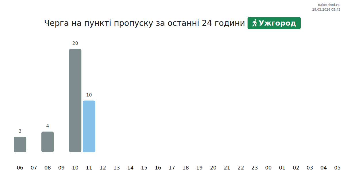 Сьогодні на пункті пропуску Ужгород очікувана черга для vehicles становить 15–60 хвилин. Піки навантаження очікуються о 08:00, 14:00, 16:00, тоді як найменші черги прогнозуються о 01:00, 02:00, 03:00. Середній час очікування протягом дня — близько 28 хвилин. Прогноз враховує денний профіль та поточні умови.