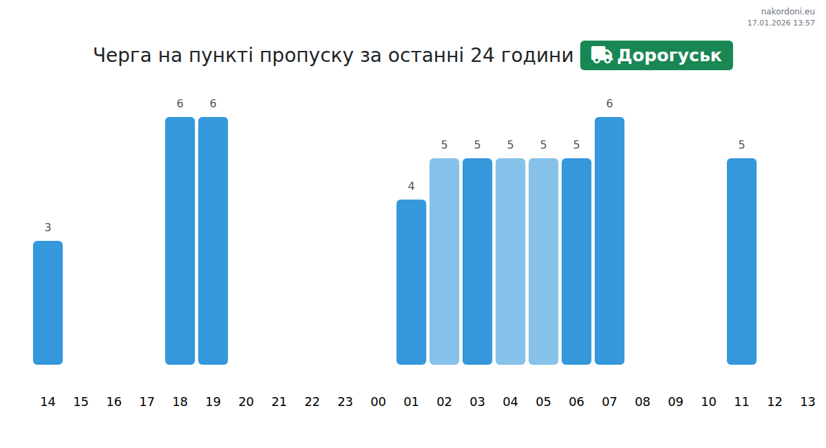 Для уникнення довгих черг на кордоні на пункті пропуску Дорогуськ - вантажний транспорт, рекомендуємо планувати перетин кордону в години найменшого навантаження. Згідно з даними за минулу добу, найменша кількість автомобілів спостерігалася між 2:00 та 14:00 годинами. Це ідеальний час для перетину кордону, щоб зекономити час і уникнути затримок.