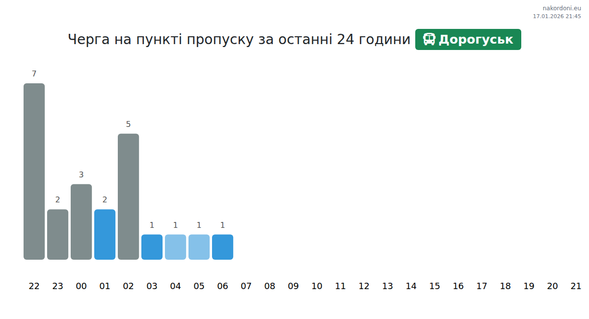 Для уникнення довгих черг на кордоні на пункті пропуску Дорогуськ - автобус, рекомендуємо планувати перетин кордону в години найменшого навантаження. Згідно з даними за минулу добу, найменша кількість автомобілів спостерігалася між 2:00 та 4:00 годинами. Це ідеальний час для перетину кордону, щоб зекономити час і уникнути затримок.