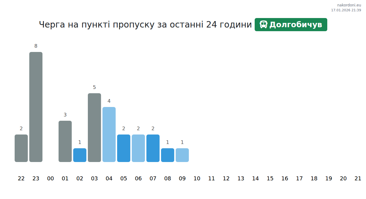 Для уникнення довгих черг на кордоні на пункті пропуску Долгобичув - автобус, рекомендуємо планувати перетин кордону в години найменшого навантаження. Згідно з даними за минулу добу, найменша кількість автомобілів спостерігалася між 2:00 та 5:00 годинами. Це ідеальний час для перетину кордону, щоб зекономити час і уникнути затримок.
