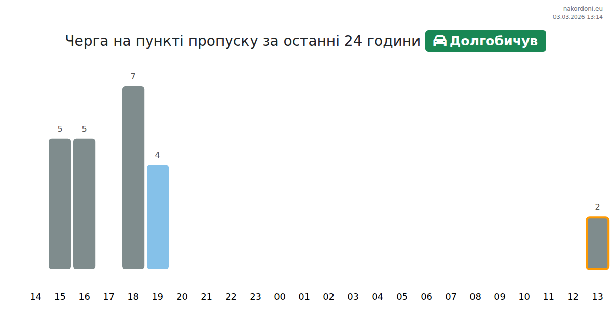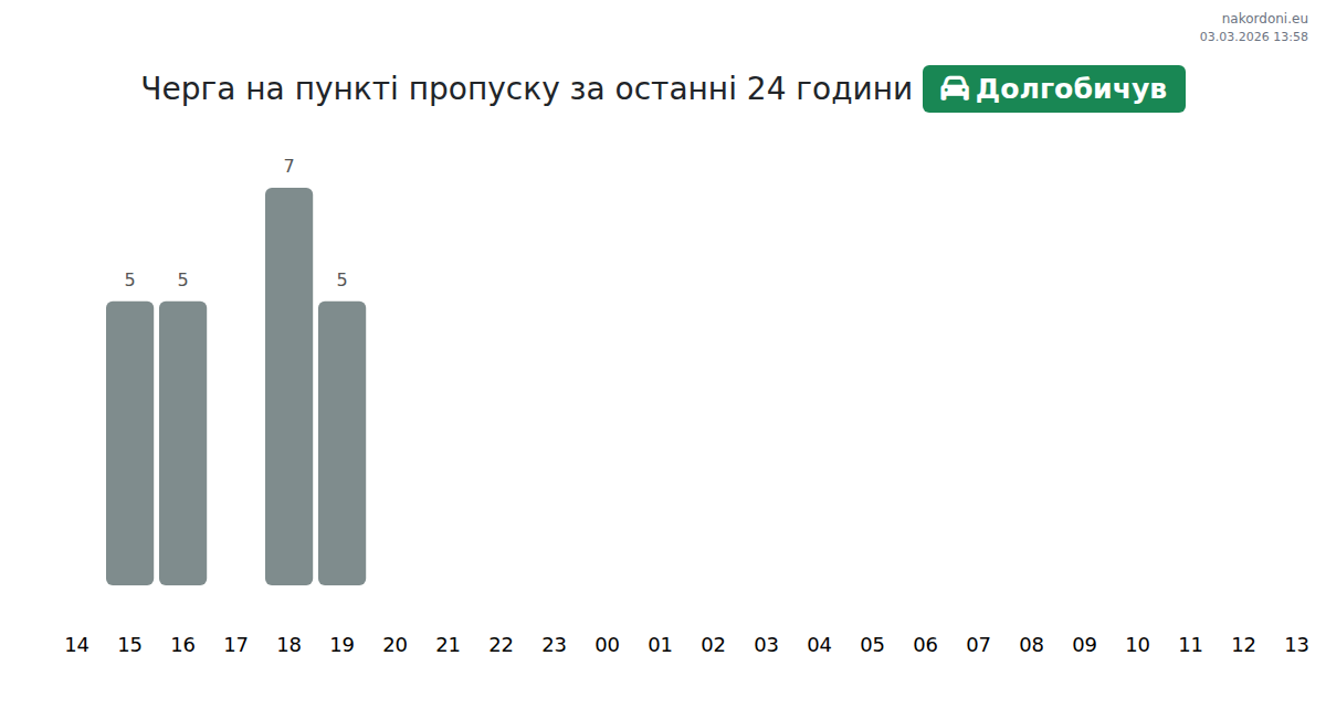 На Долгобичув очікуваний час очікування для легкових авто 15-75 хвилин. Уникайте годин пік: 17:00, 03:00, 02:00. Найкращий час для перетину: 11:00, 22:00, 04:00.