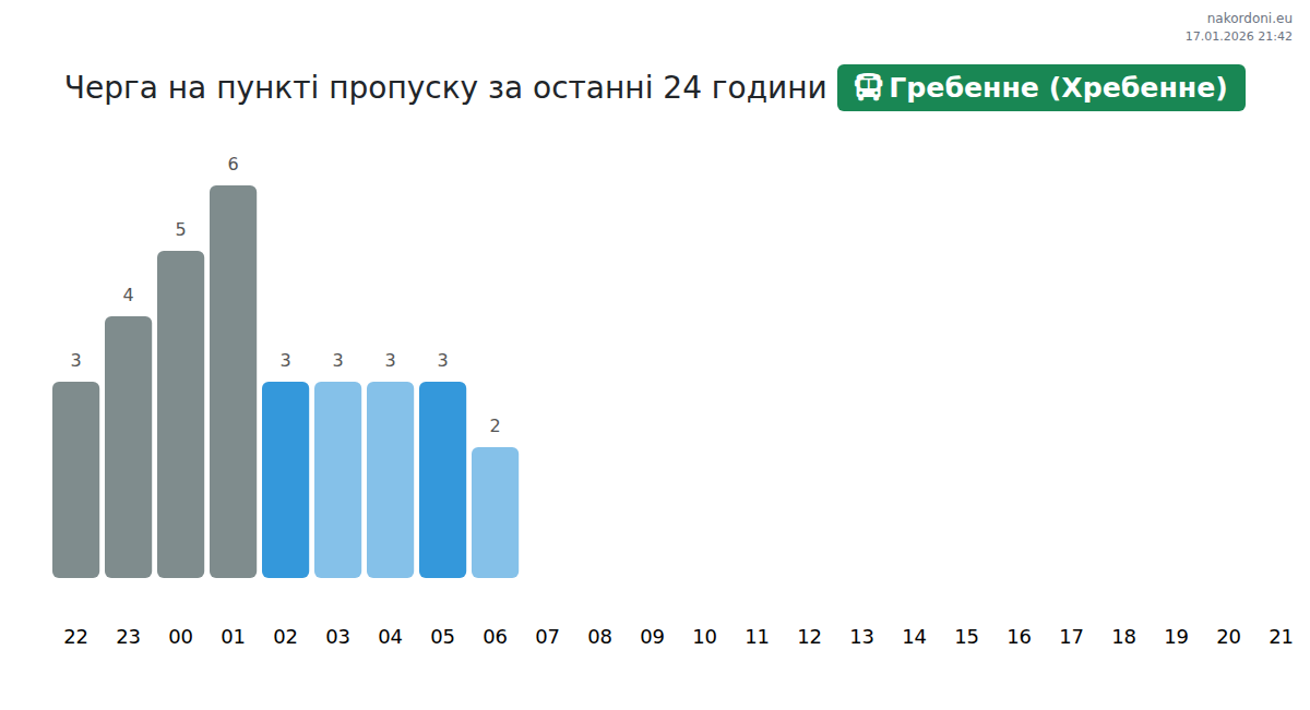 Для уникнення довгих черг на кордоні на пункті пропуску Гребенне (Хребенне) - автобус, рекомендуємо планувати перетин кордону в години найменшого навантаження. Згідно з даними за минулу добу, найменша кількість автомобілів спостерігалася між 11:00 та 14:00 годинами. Це ідеальний час для перетину кордону, щоб зекономити час і уникнути затримок.