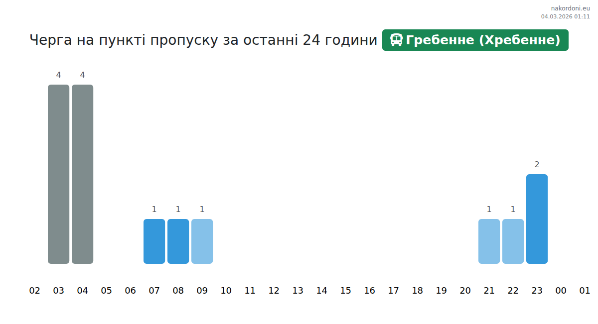 Для уникнення довгих черг на кордоні на пункті пропуску Гребенне (Хребенне) - авто, рекомендуємо планувати перетин кордону в години найменшого навантаження. Згідно з даними за минулу добу, найменша кількість автомобілів спостерігалася між :00 та 6:00 годинами. Це ідеальний час для перетину кордону, щоб зекономити час і уникнути затримок.