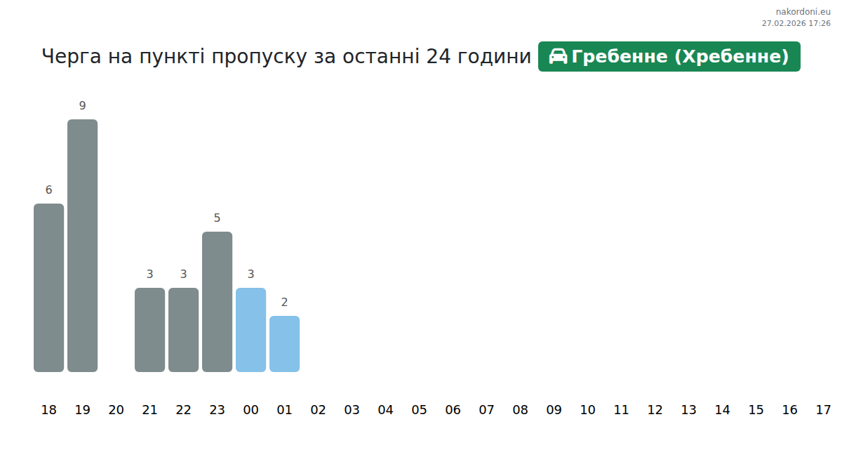 За період 26.02.2026 з 00:00 по 23:59 на кордоні на пункті пропуску Гребенне (Хребенне) - авто були зафіксовані наступні ключові моменти: