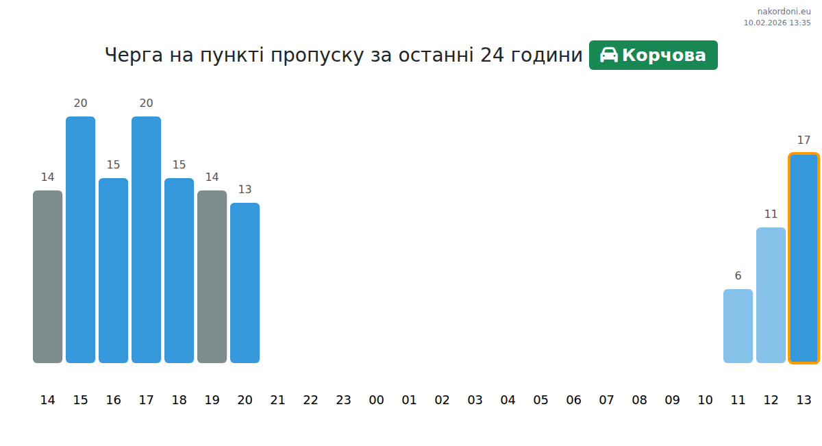 На пункті Корчова прогнозується час очікування для легкових автомобілів 23-103 хвилини. Уникайте пікових годин: 13:00, 15:00, 14:00. Найкоротші черги очікуються о 23:00, 04:00 та 05:00.