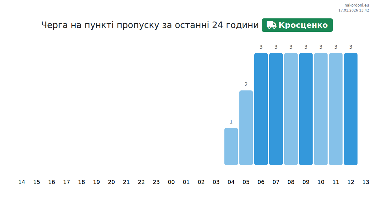 За період 16.01.2026 з 00:00 по 23:59 на кордоні на пункті пропуску Кросценко - вантажний транспорт (до 7,5 тонн) були зафіксовані наступні ключові моменти: