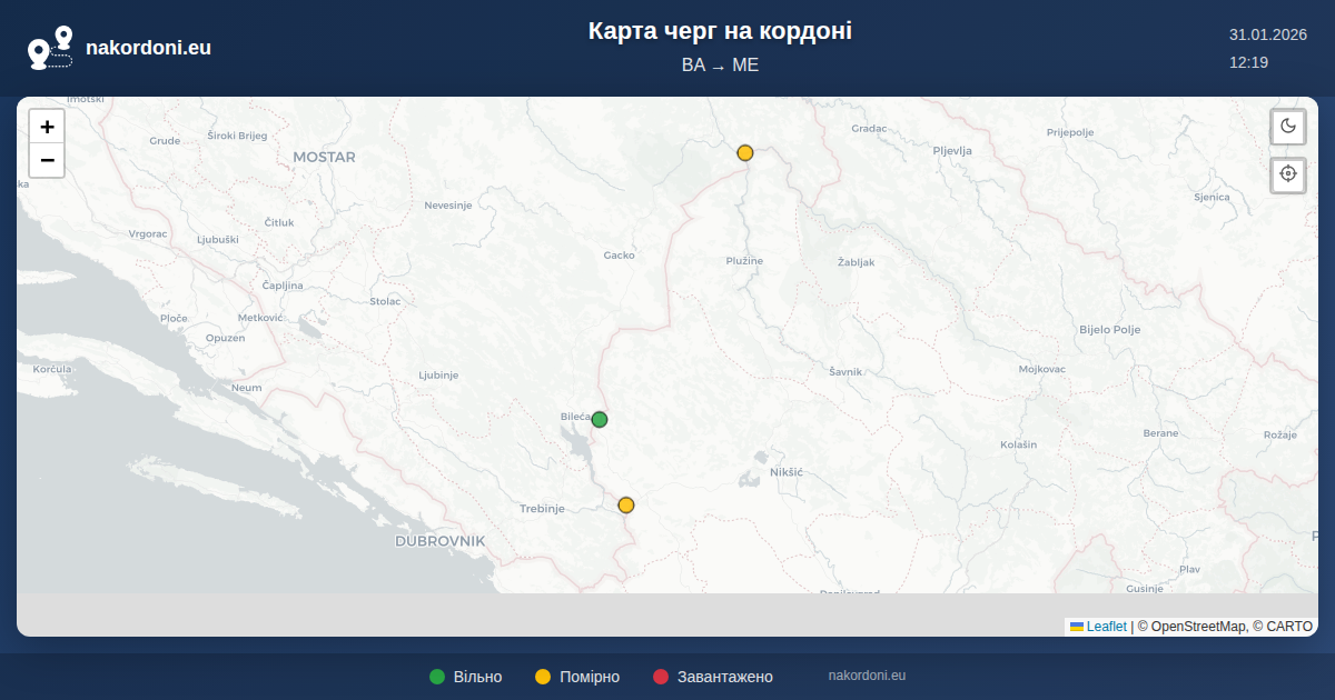 Інтерактивна карта кордону Боснія і Герцеговина — Чорногорія з онлайн чергами, прогнозом та статусом переходів