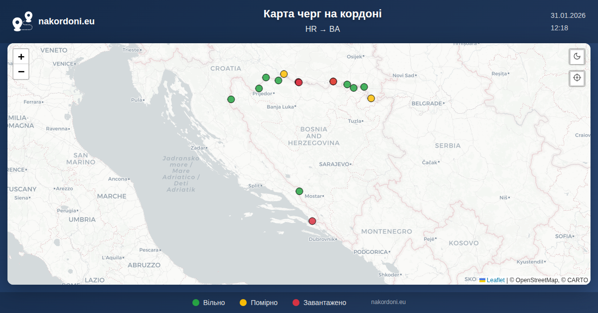 Інтерактивна карта кордону Хорватія — Боснія і Герцеговина з онлайн чергами, прогнозом та статусом переходів
