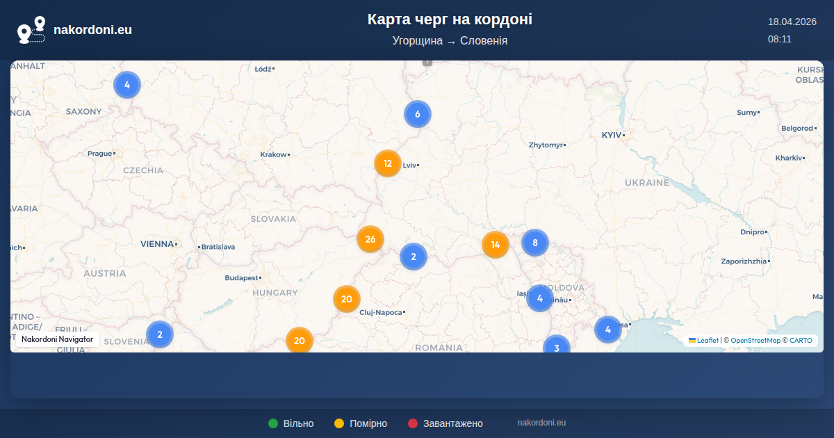 Інтерактивна карта кордону Угорщина — Словенія з онлайн чергами, прогнозом та статусом переходів
