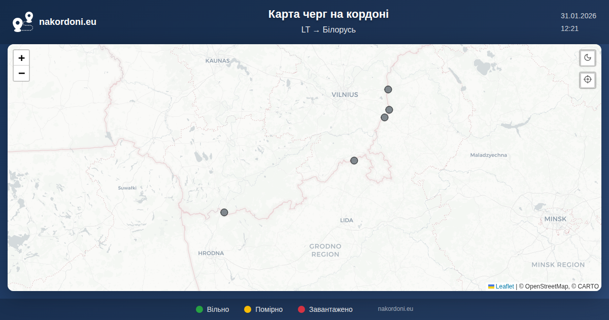 Інтерактивна карта кордону Литва — Білорусь з онлайн чергами, прогнозом та статусом переходів