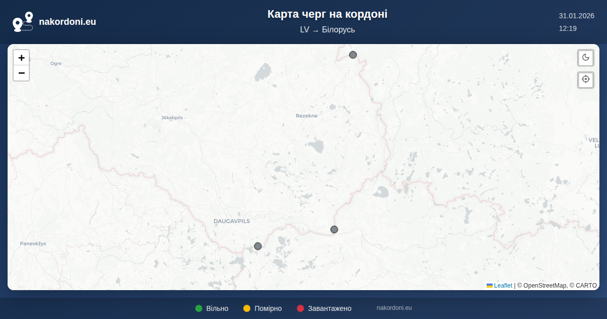 Інтерактивна карта кордону Латвія — Білорусь з онлайн чергами, прогнозом та статусом переходів